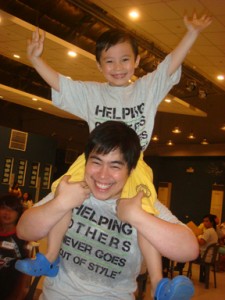 I wanted to take Nathan along because I felt it would be an eye-opening experience for him to see the situation of other children less fortunate than he. He was a real trooper. We were assigned to the ‘entertainment area,’ which basically ran groups of ten kids per group through a series of short games designed to keep them occupied while their dining tables were being prepared. Nathan helped in the games, holding the hands of kids and jumping them through the ‘tubig-lupa’ (water-land) game, as well as the ‘hep-hep hooray!’ game.