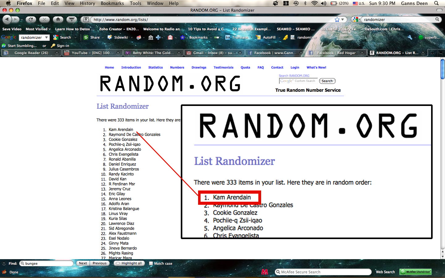 The rules were you simply had to “Like” GannsDeen.com’s official Facebook fan page. 333 persons liked my fan page as of June 13, 2010, 12nn, so I entered these names into Random.org’s Random List Generator, as appears below: