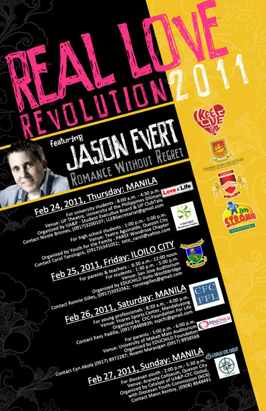 Real Love Revolution 2011 features bestselling author Jason Evert, one of America’s foremost pure love advocates, who will talk to the minds and hearts of the youth, their parents, and professional educators, on how to shape lives of the youth towards their common destiny of real love, fidelity, and well-being. Evert is a best-selling author of several books, including If You Really Loved Me, Theology of the Body for Teens, Pure Love, Purity 365, Pure Faith: A Prayer Book for Teens, Pure Intimacy, Pure Womanhood and Pure Manhood; a master’s degree holder in Theology, Evert has been on the Catholic Book Publishers Association bestseller list for youth with his book, Theology of His Body/Theology of Her Body. His latest book, Raising Pure Teens, is a piece aimed at helping parents employ Biblical strategies to raise their children to remain pure in their adolescence into adult years. Ten years ago, he founded Pure Love Club, which is an international alliance of young people who promote chastity in over 30 countries.
