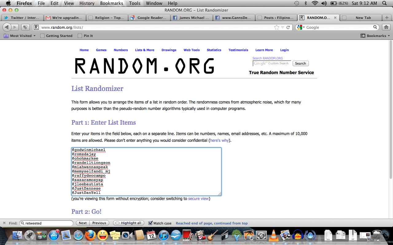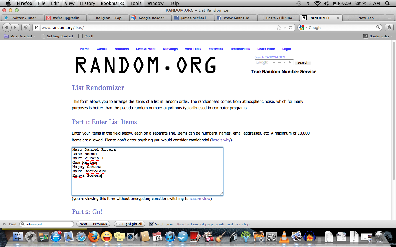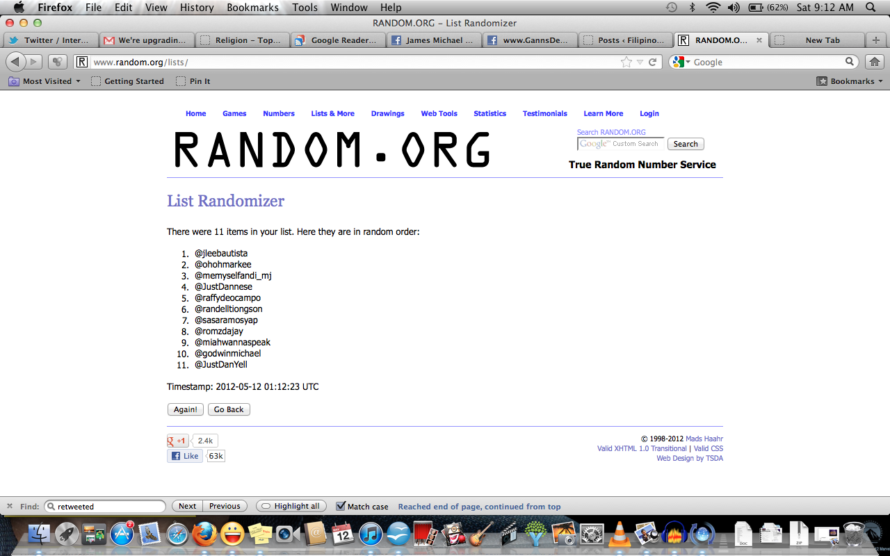 Screenshot of the randomized list. The person on top is the winner, so congratulations to Mark Daniel Rivera for winning a Planetshakers Heal Our Land CD/DVD combo! Yay!