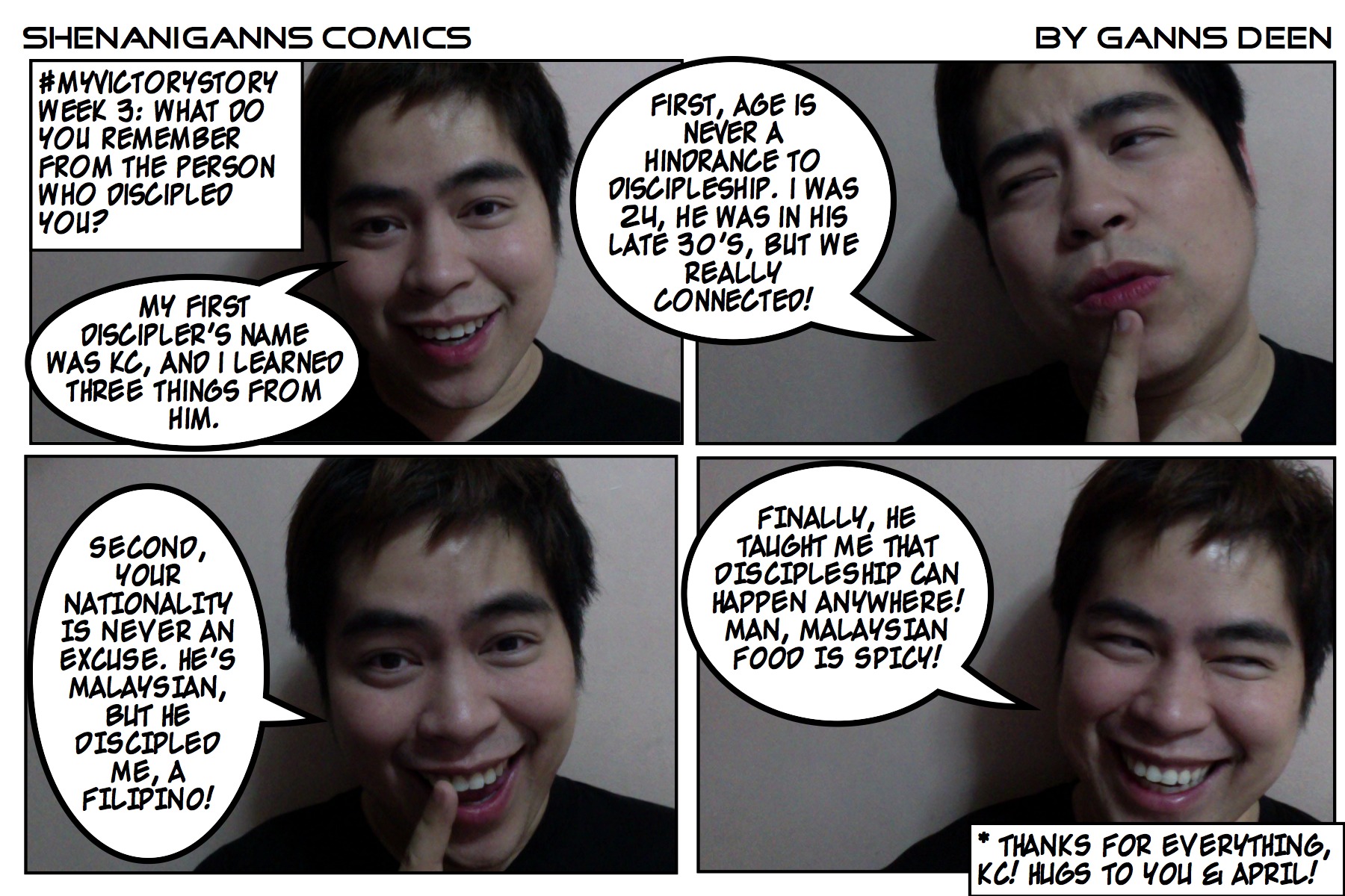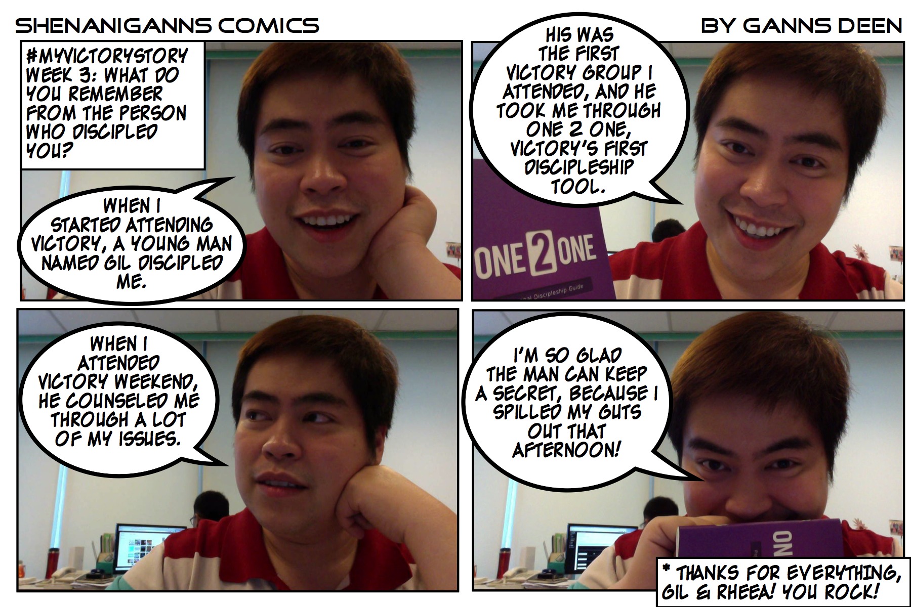 Hi! My name is Ganns, and I’m the author of the wildly popular – more than 400 likes on Facebook! – ShenaniGanns Comics series of real life comic strips. This week, I’m posting five strips in support of #myVictoryStory’s third week: What do you remember from the person who discipled you? I honor five men who profoundly impacted my life through discipleship.