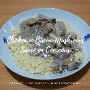 But we need to be good stewards, and I didn’t want to throw it out, so I looked in the fridge at what I had. Two strips of bacon–leftover from the bacon-chicken kebabs–and a couple of chicken breasts. I knew I had some Campbell’s Mushroom soup, so I said, okay, creamy chicken with bacon. Oh my goodness, yes, it’s perfect with couscous.