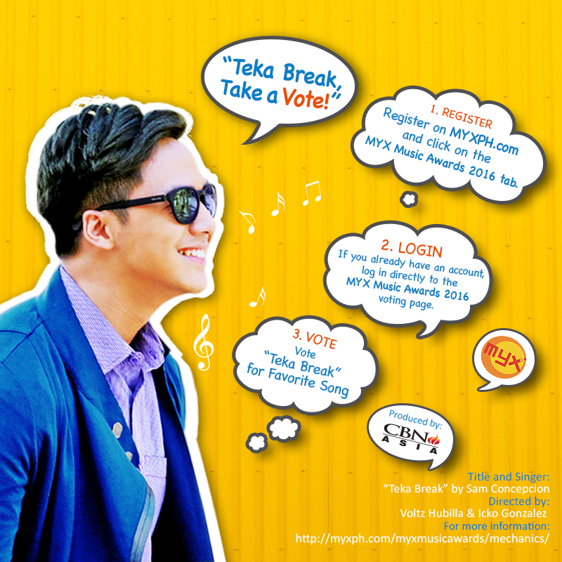 Sam Concepcion’s “Teka Break” has been nominated for two major categories in the MYX Music Awards 2016 namely: Favorite Song and Special Awards for Best Music Video. “Teka Break” is one of the songs included in the “Transforming Love” album produced by CBN Asia for its 20th anniversary.